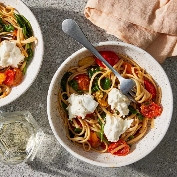 Luxurious yet weeknight-easy. Warm pasta gently melts pockets of creamy burrata throughout a simple tomato-spinach sauce. Use peak-season tomatoes and their natural juices to create a sun-kissed dressing—no extra work required.